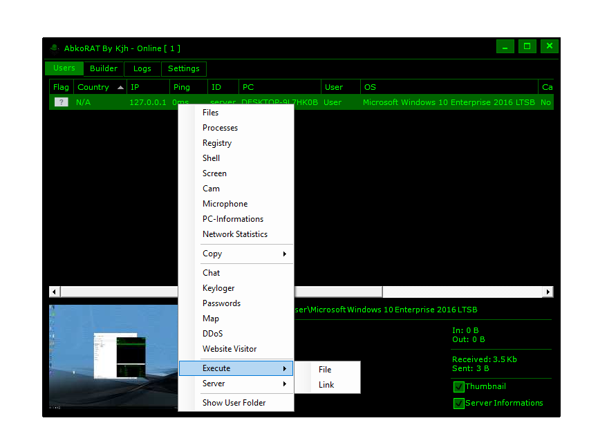 Abko RAT 2026 collects detailed metadata including installation paths, registry entries, and system configurations. This helps attackers understand the environment and plan further attacks. - Live screen previews: